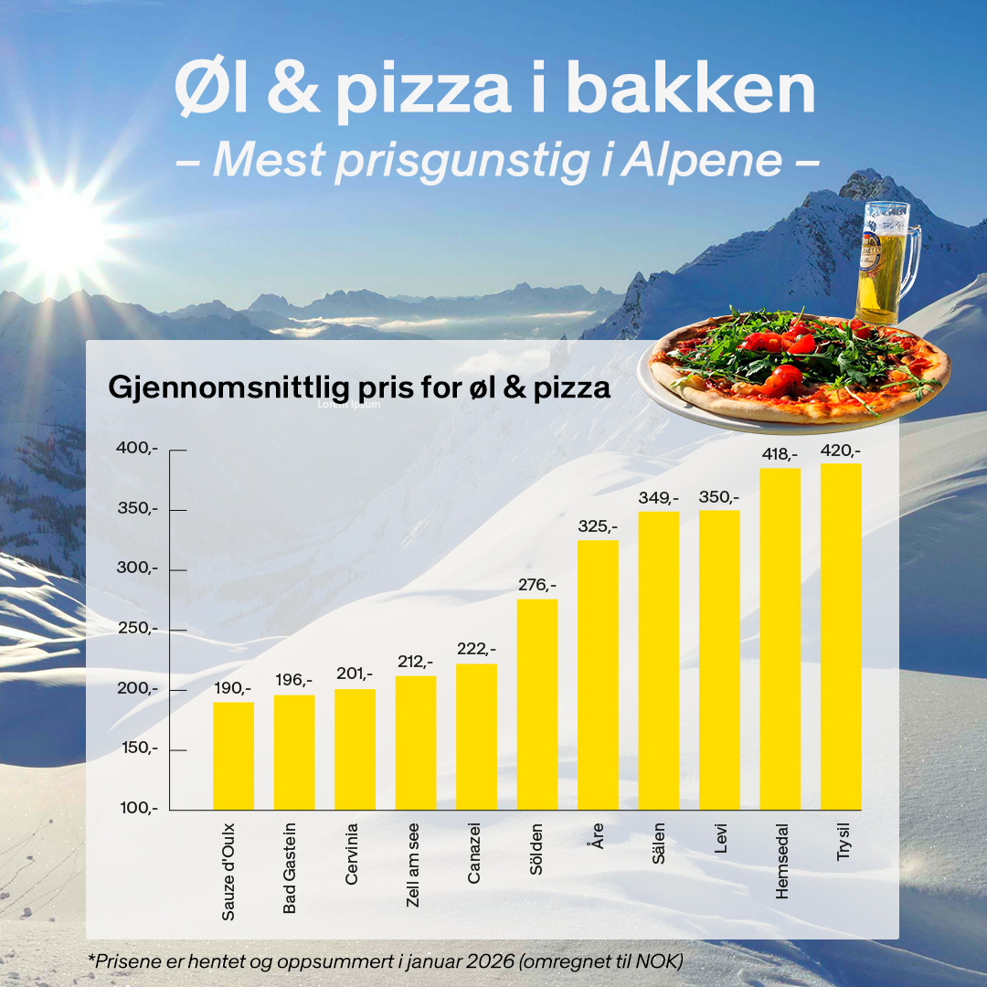 Før vinteren har STS Alpereiser sammenlignet prisen på en klassisk skilunsj – pizza og øl i bakken – mellom populære destinasjoner i Alpene og de skandinaviske fjellene. Resultatet er tydelig: prisnivået i svenske og norske fjelldestinasjoner er markant høyere.