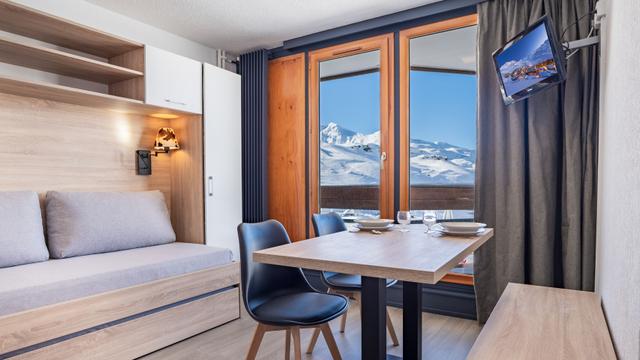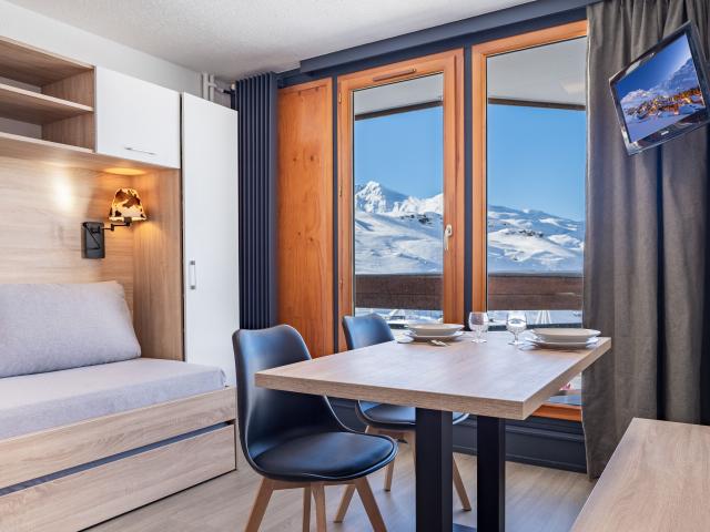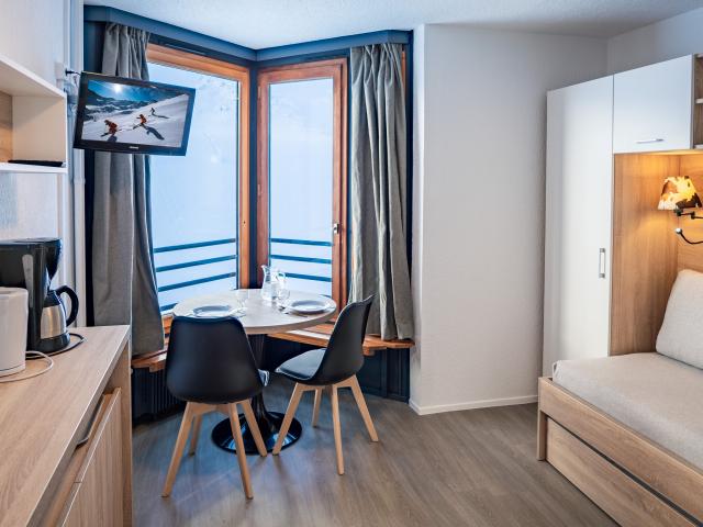 Studio leilighet med kombinert soverom og stue med sovesofa, kjøkkenkrok, bad/dusj og WC.