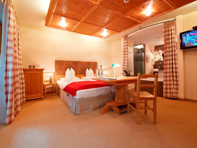 Juniorsuite delux med dobbeltseng, ekstra senger, bad/dusj, WC og balkong.