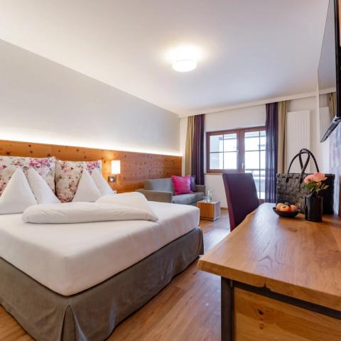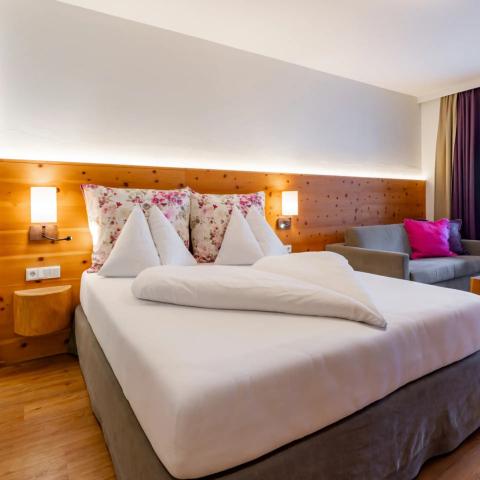 Juniorsuite med dobbeltseng og ekstra senger, bad/dusj, WC og balkong.